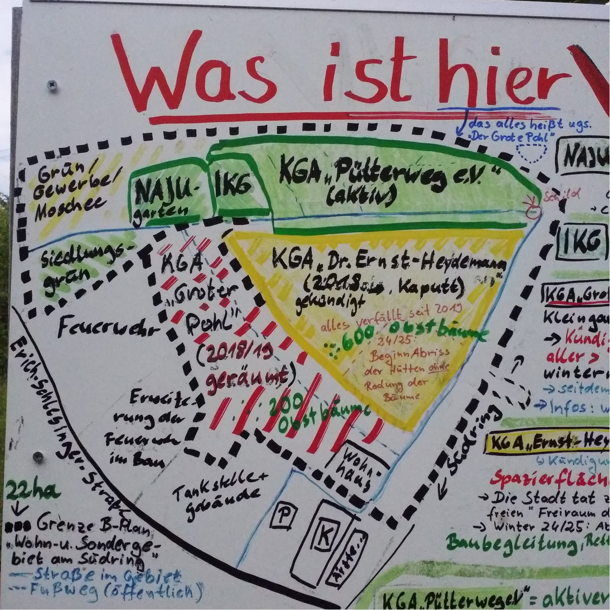 Das ist ein Foto von dem Großen Infoschild am Ost-Eingang der KGA Püttweg. Es gibt 3 verschiedene Zustände der 3 großen (ehemaligen) Kleingartenvereine dort: